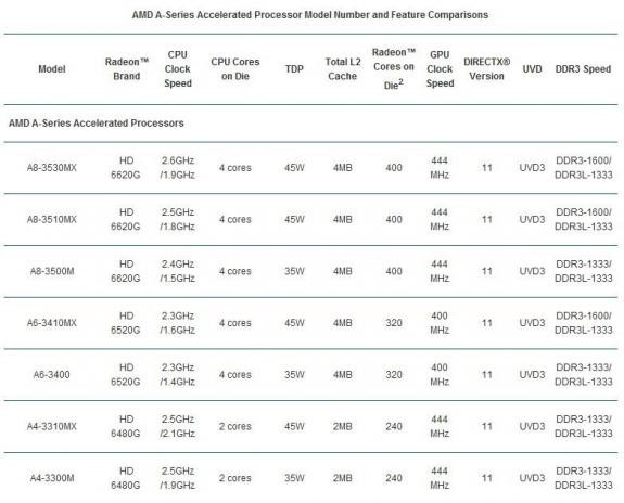Новые процессоры обеспечивают высокую производительность, более продолжительный срок автономной работы (до 10,5 часов), что для мобильных устройств большой плюс, а также воспроизведение HD графики. Технология Turbo Core призвана повысить частоту ядер, а режим Dual Graphics позволяет объединить ресурсы встроенного графического ядра с дискретной видеокартой.Новые APU имеют по два или четыре х86-совместимых ядра Stars, графический блок с поддержкой DirectX 11, двухканальный контроллер памяти DDR3, выделенный блок ускорения видео высокой чёткости (UVD3), высокоскоростную шину и целый букет интерфейсов, в частности PCI-E x16, HDMI и DVI.